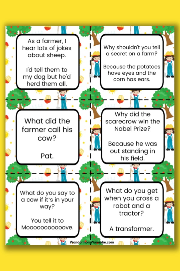 Printable farm jokes for kids will keep everyone in stitches. This fun activity easy to print off at home and can be put in your child’s lunch box or kids can put on a comedy show for the family.